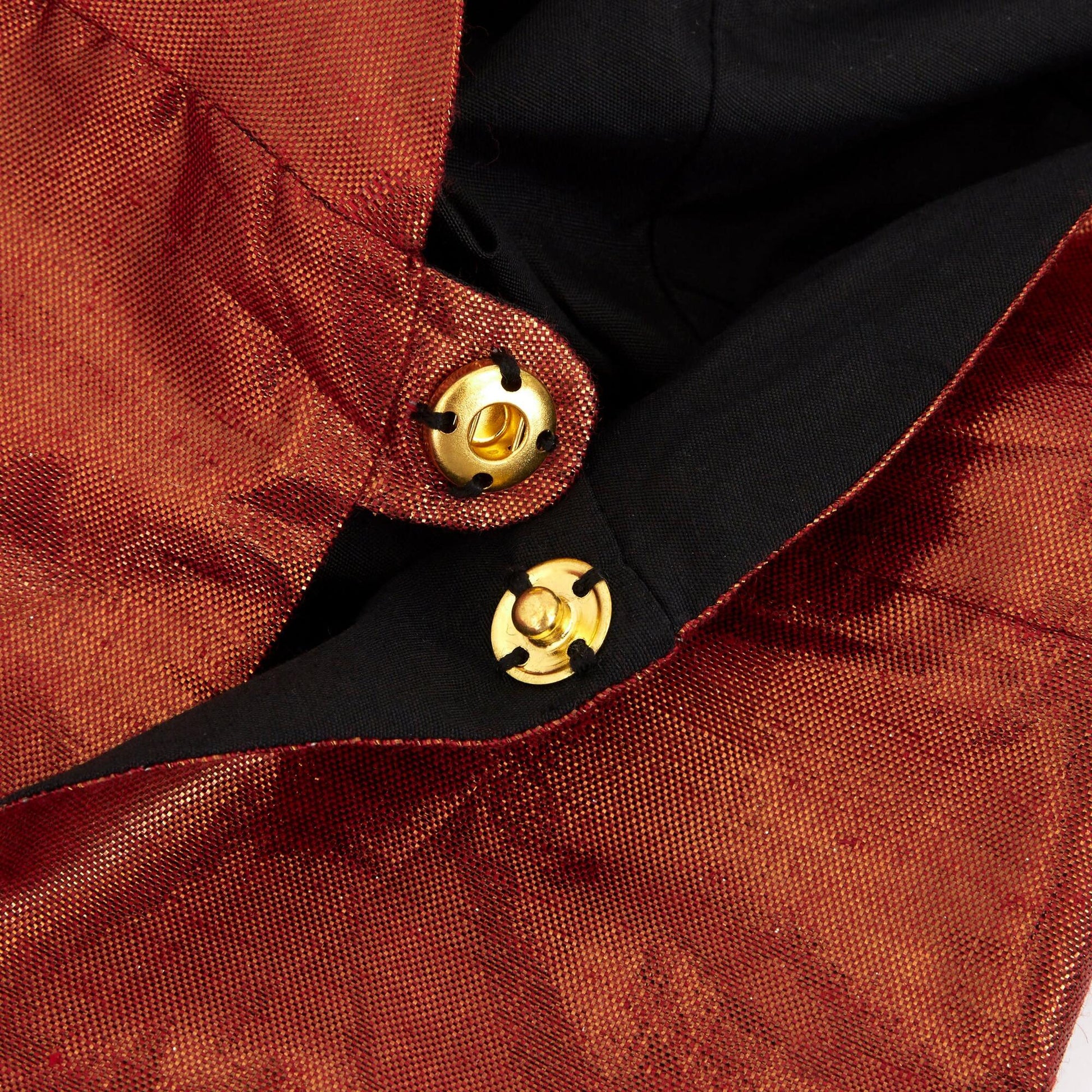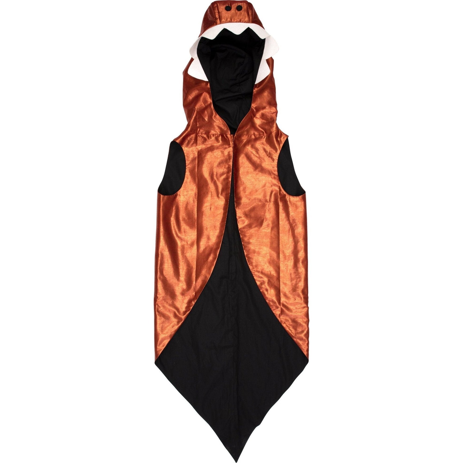 - The hooded cape is crafted from red and copper lame, and lined with black polycotton